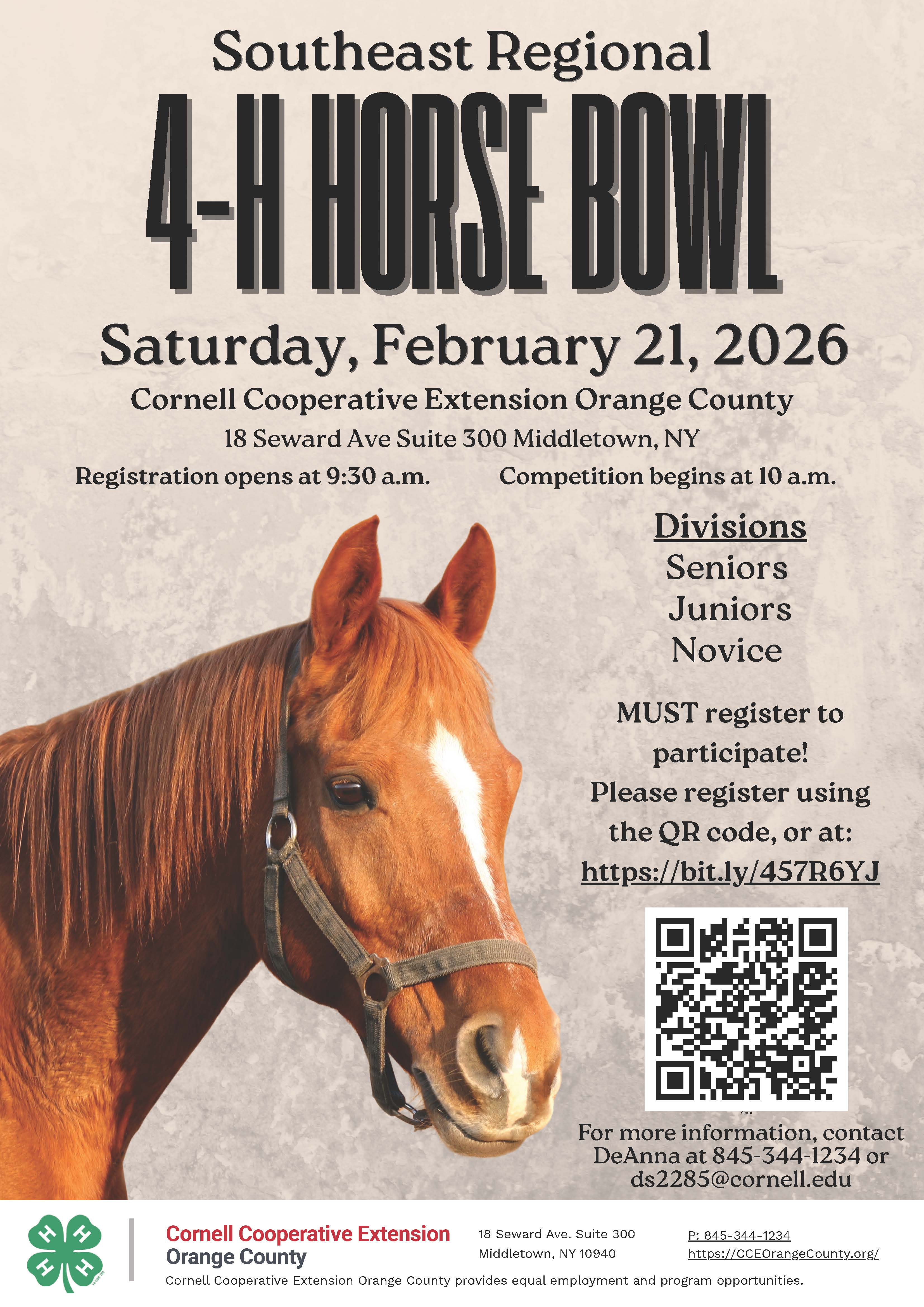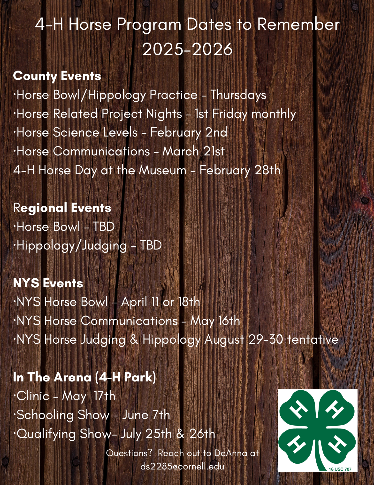 The 4-H Horse Program promotes knowledge of horsemanship, responsible, ethical equine use, care, and management. Youth who participate in 4-H horse programs develop life skills that include leadership, responsibility, sportsmanship, teamwork, community service, a positive attitude, and a sense of self-worth. 4-H Horse Youth will engage in a wide variety of projects, contest and events.