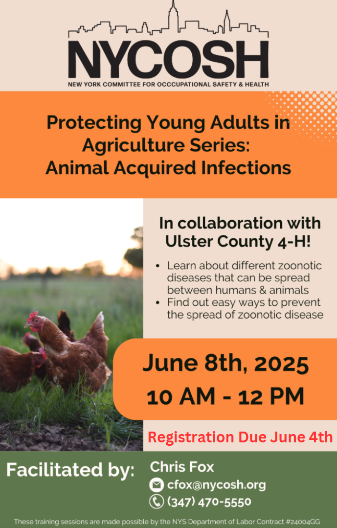 REGISTER HERE IN PERSON AND ONLINE SESSIONS $30/4-H MEMBER ($45 FOR NON-MEMBER) Open to Youth 14+who need to receive certification to work on a farm this summer and/or who is looking for a fun, educational experience. Participants MUST attend all sessions and take and pass the test to be certified Questions? Contact Zoe Nafis at zrl7@cornell.edu |