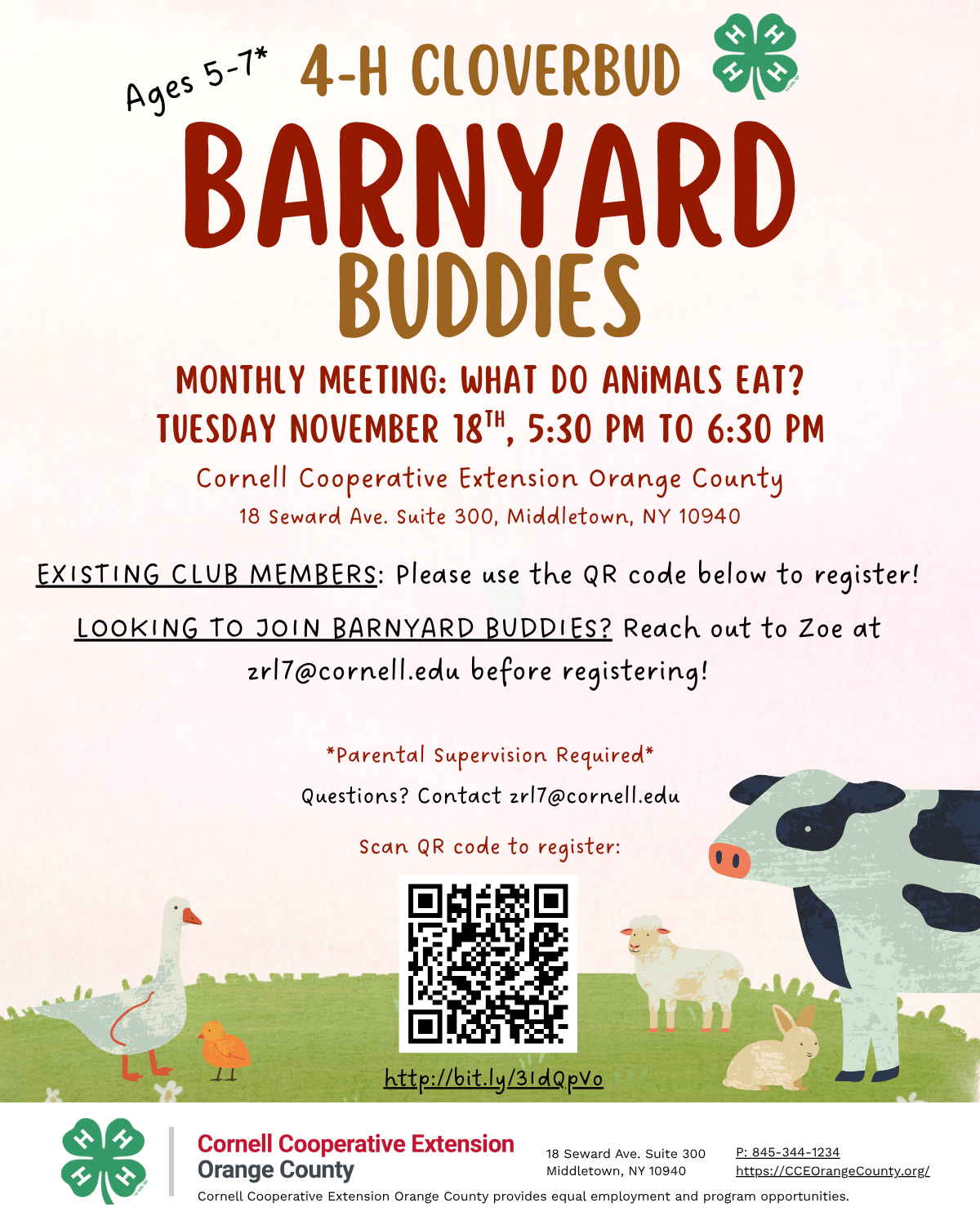 REGISTER HERE Are your children interested in cows, sheep, rabbits, and other farm animals? Join the Livestock Learners Cloverbud Club to get involved in Orange County 4-H. Questions? Contact Zoe Nafis at zrl7@cornell.edu |