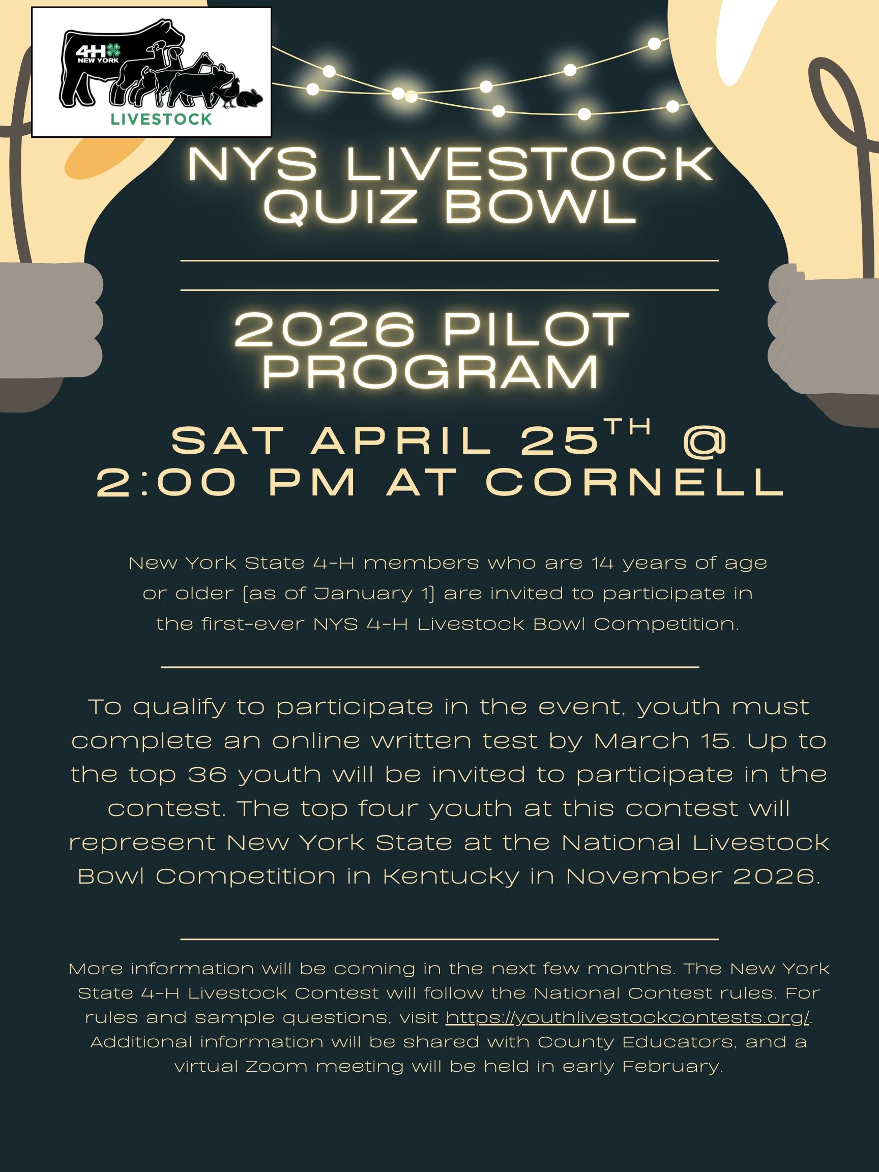 2026 Pilot Program! A brand new pilot program for youth interested in livestock education: the NYS 4-H Livestock Quiz Bowl. At the national level, the 4-H Livestock Quiz Bowl has existed for approximately 15 years; New York State has never sent a team. In the past few years, youth participating in judging and skillathon events have expressed strong interest in bringing this opportunity to NYS. This has been youth driven and I have met with a small committee to develop a pilot program for our state.