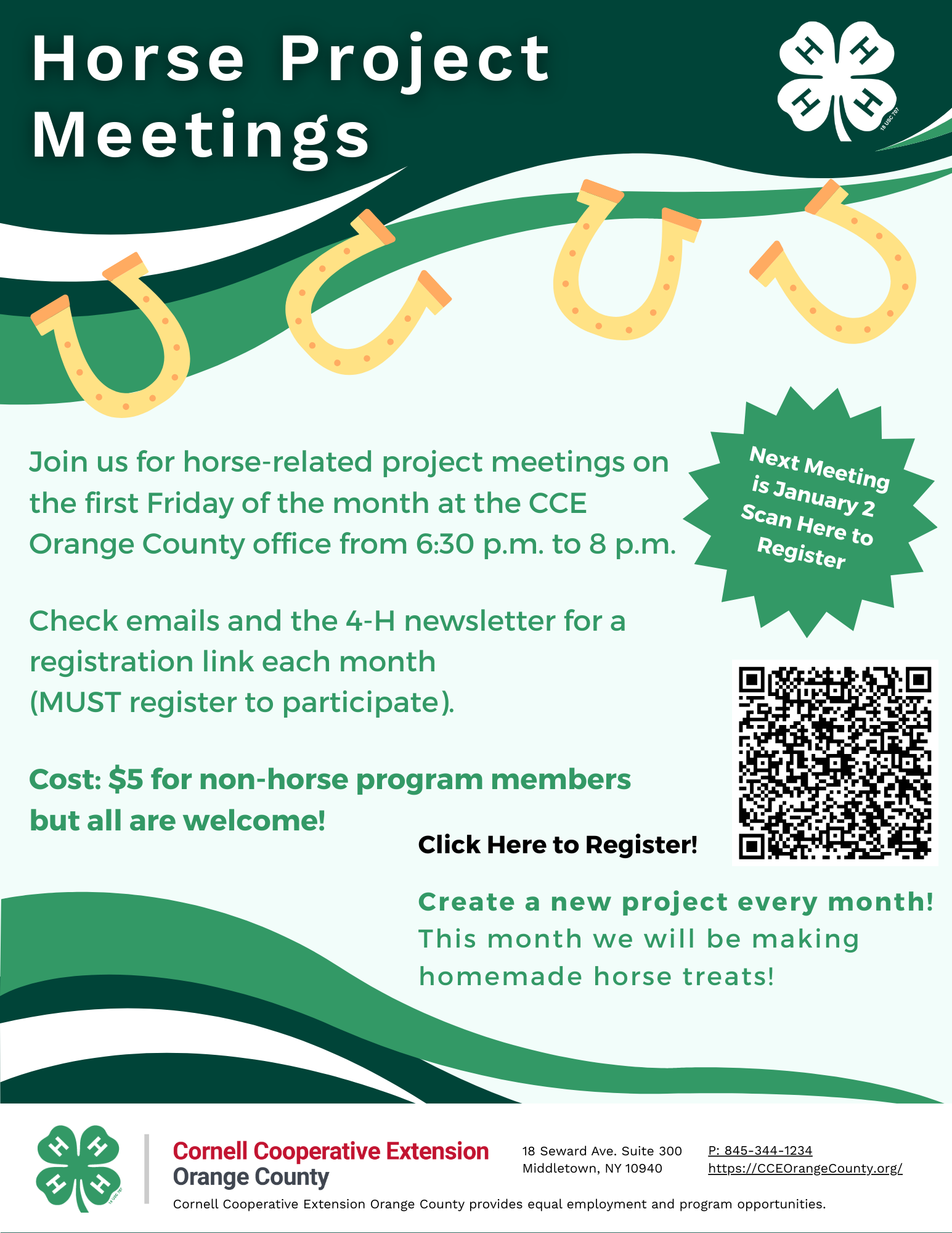 REGISTER HERE Join us for horse-related project meetings on the first Friday of the month at the CCE Orange County office from 6:30 p.m. to 8 p.m. Check emails and the 4-H newsletter for a registration link each month (MUST register to participate). Cost: $5 for non-horse program members but all are welcome! |