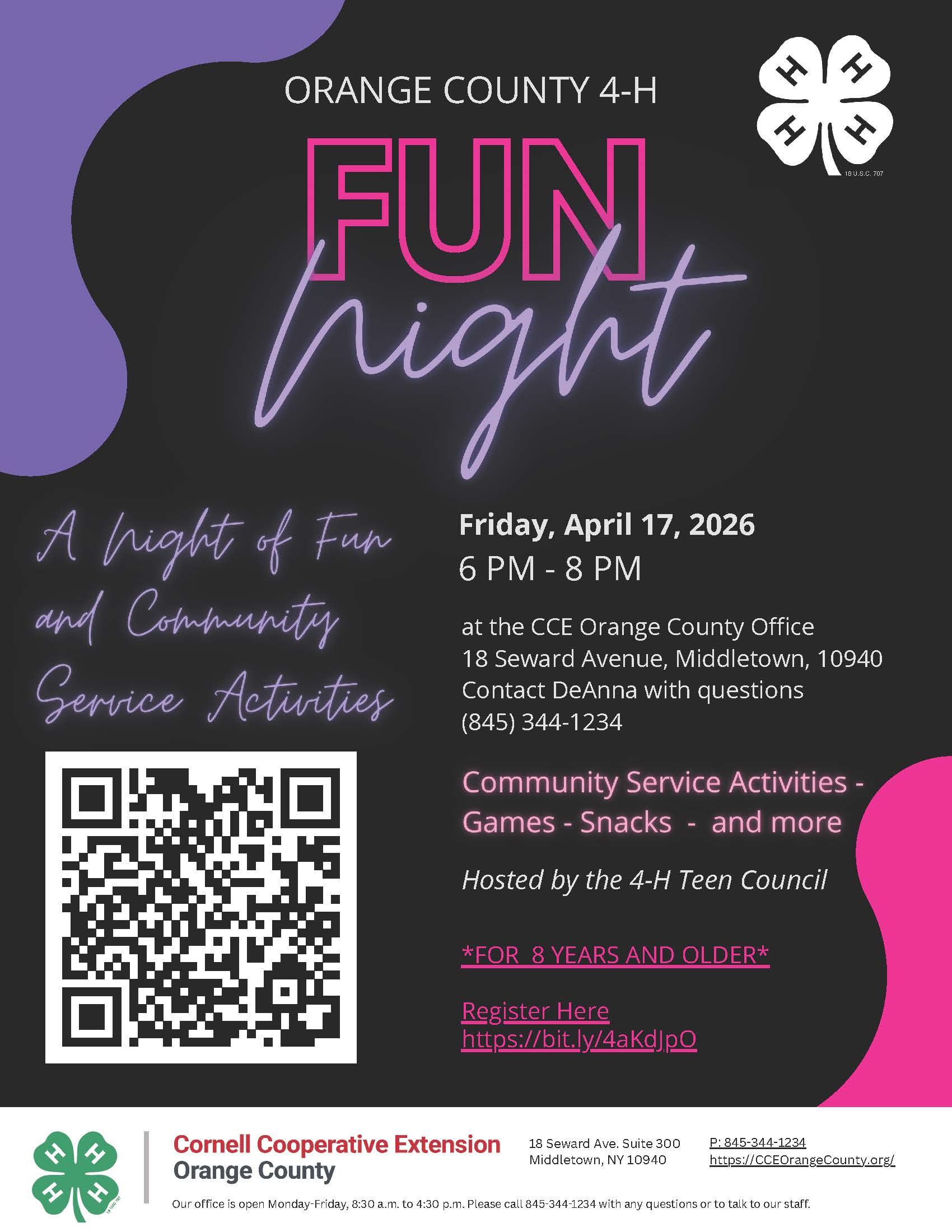 REGISTER HERE Join us for an evening of friendship, laughter, and giving back at our 4-H Fun Night! Youth ages 8 and older are invited to take part in hands-on community service projects and exciting group games that build teamwork and leadership skills. It’s a great way to connect with other 4-H’ers, make a difference in the community, and have a whole lot of fun! For more information contact DeAnna Sardella ds2285@cornell.edu |