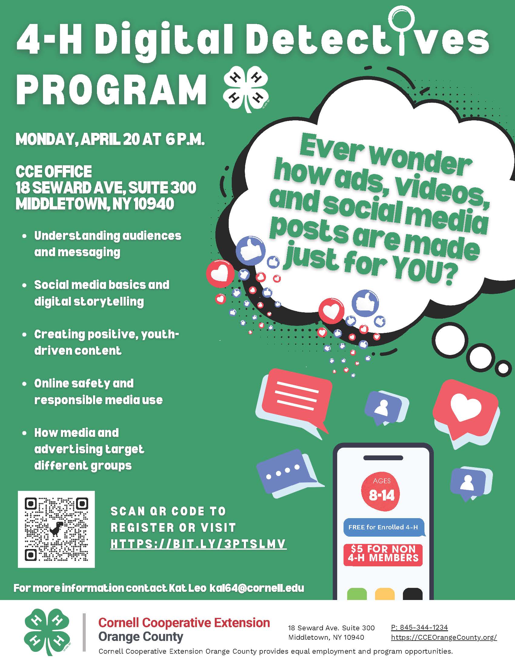 Register Here Can you crack the code behind ads, videos, and social media posts? Join 4-H Digital Detectives and discover how media is designed to grab your attention—and learn how to create your own! Put your skills to the test by creating real content to share your 4-H story! Contact Kat Leo at 845-344-1234 or kal64@cornell.edu Open to youth ages 8–14 April 20 @ 6pm CCE office Middletown Spots are limited—don’t miss your chance to become a Digital Detective! |