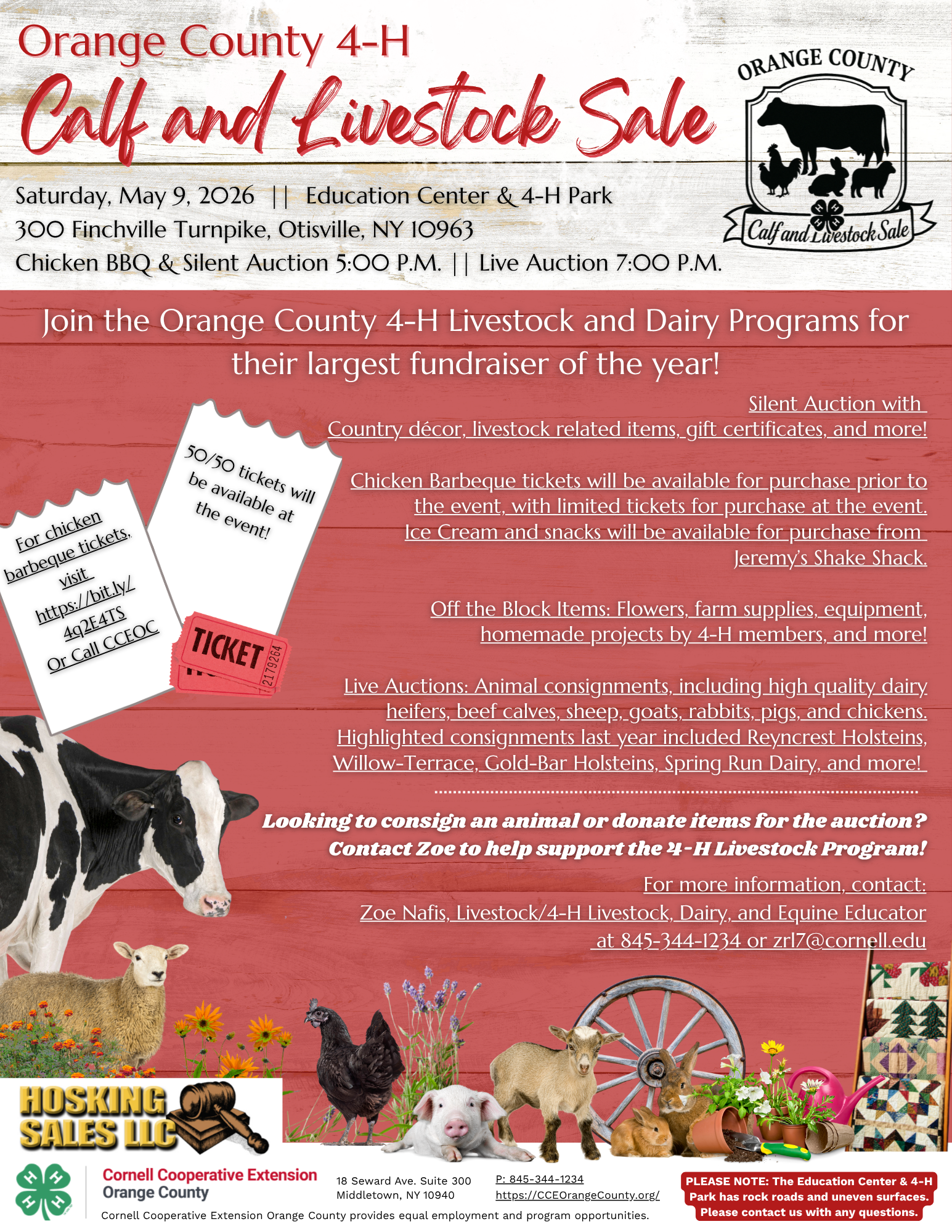 Orange County 4-H Calf and Livestock Sale | The Orange County Dairy and Livestock Program is excited to announce the 28th Annual Orange County 4-H Calf and Livestock Sale! Starting with a chicken BBQ and silent auction at 5:00 pm and the live auction at 7:00 pm. There is something for everyone! Hope to see some of you there, thank you! Zoe Nafis Agriculture Livestock/4H Livestock Program Manager t. 845-344-1234, ext. 258 |