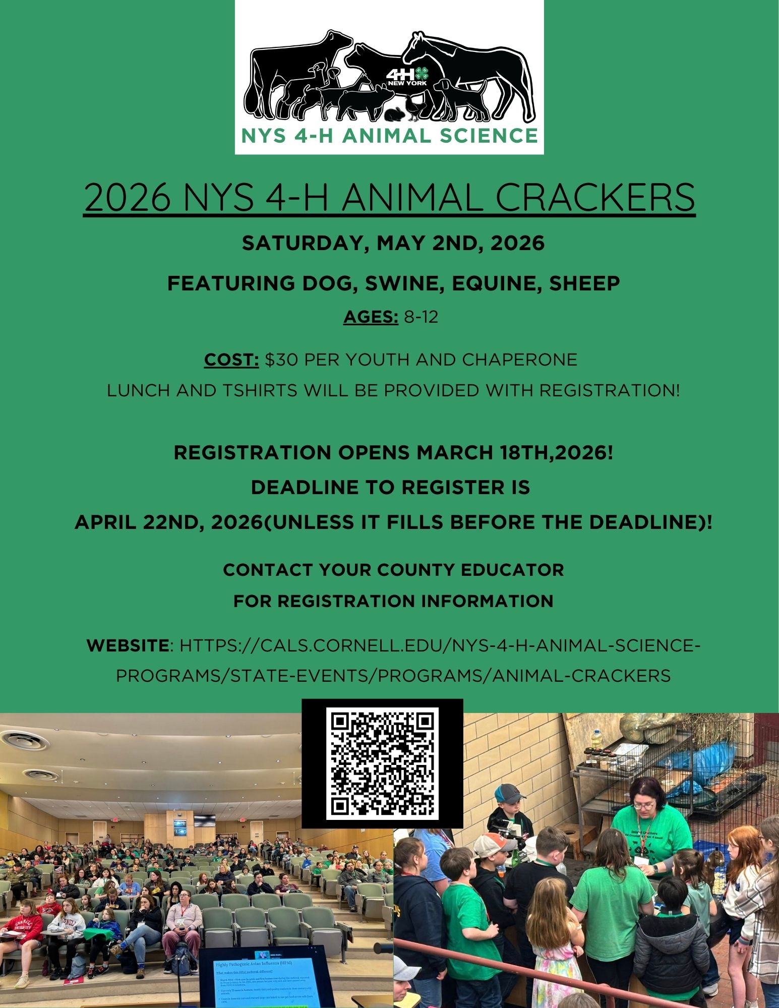 Ages 8-12 The cost of the workshop is $30 for youth and chaperones, which includes lunch, shirts and materials. This year’s program will feature engaging topics focused on horses, sheep, swine, and dogs. Participants can look forward to a variety of interesting, educational, and hands-on activities designed to create a fun and memorable learning experience. For more details, visit https://cals.cornell.edu/nys-4-h-animal-science-programs/state-events/programs/animal-crackers TO REGISTER CONTACT Zoe Nafis @ zrl7@cornell.edu |